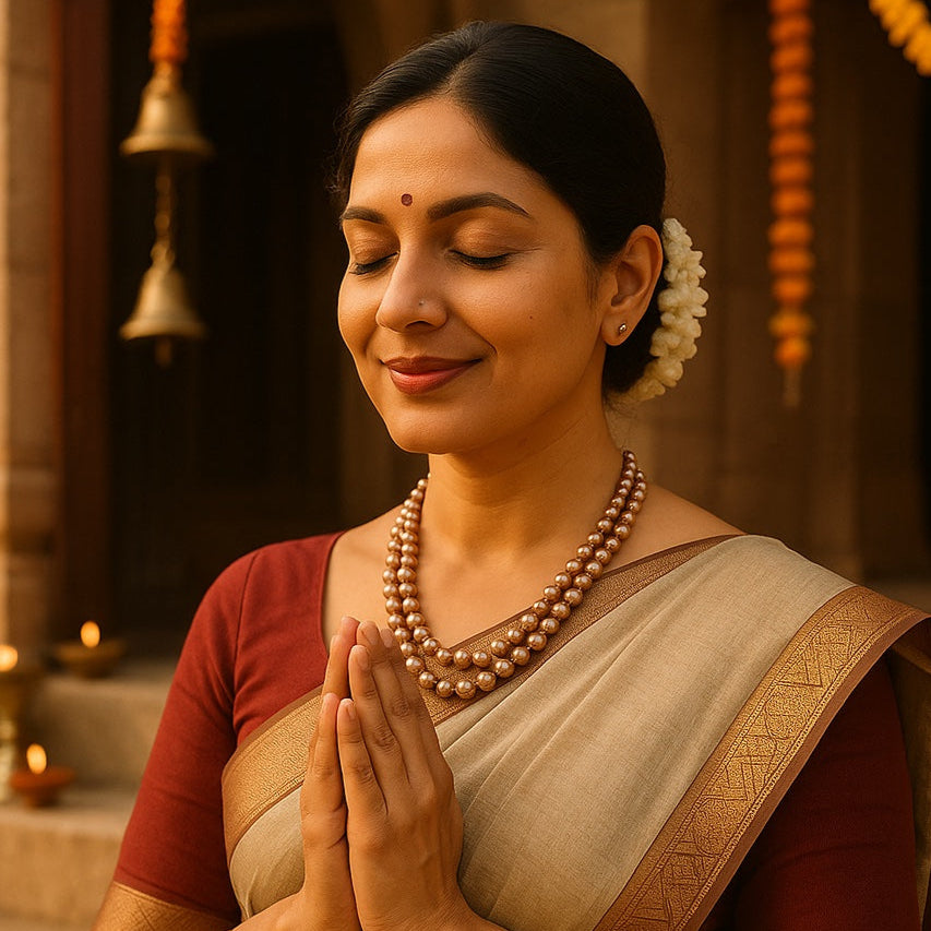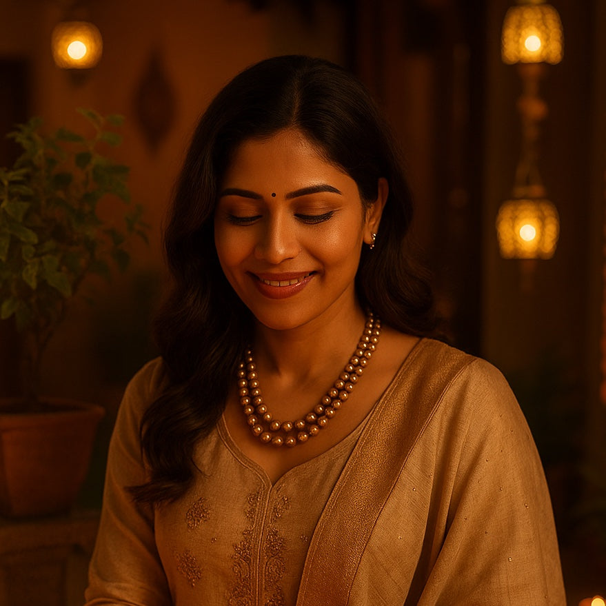 Elegant yet earthy, the Champagne Bronze Glow Necklace is crafted with double strands of warm-toned 8mm shell pearls that catch the light with a soft golden-bronze shimmer. Whether it's a puja morning, Rakhi celebration, or a cozy dinner party — this necklace elevates your look with effortless grace.