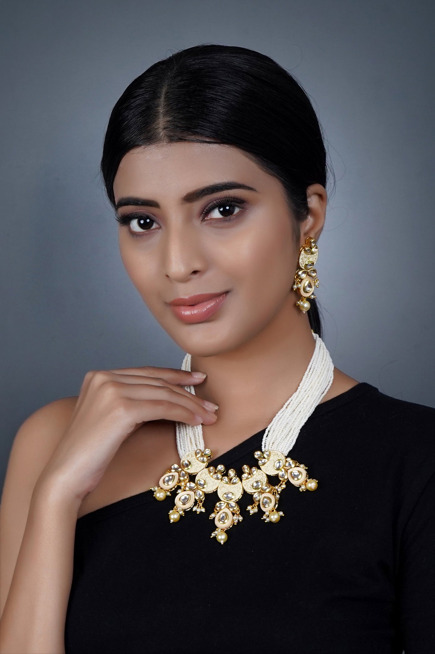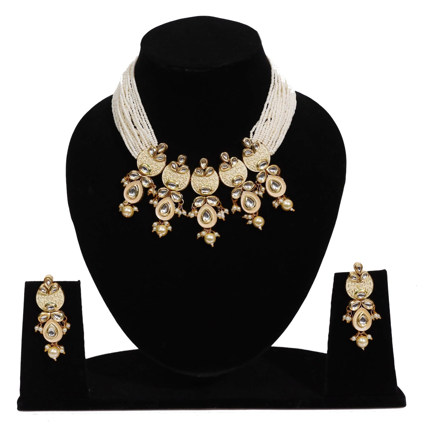 Imeora Designer Golden Multi White Line Necklace Set With Stone Hangings And Handmade Dori