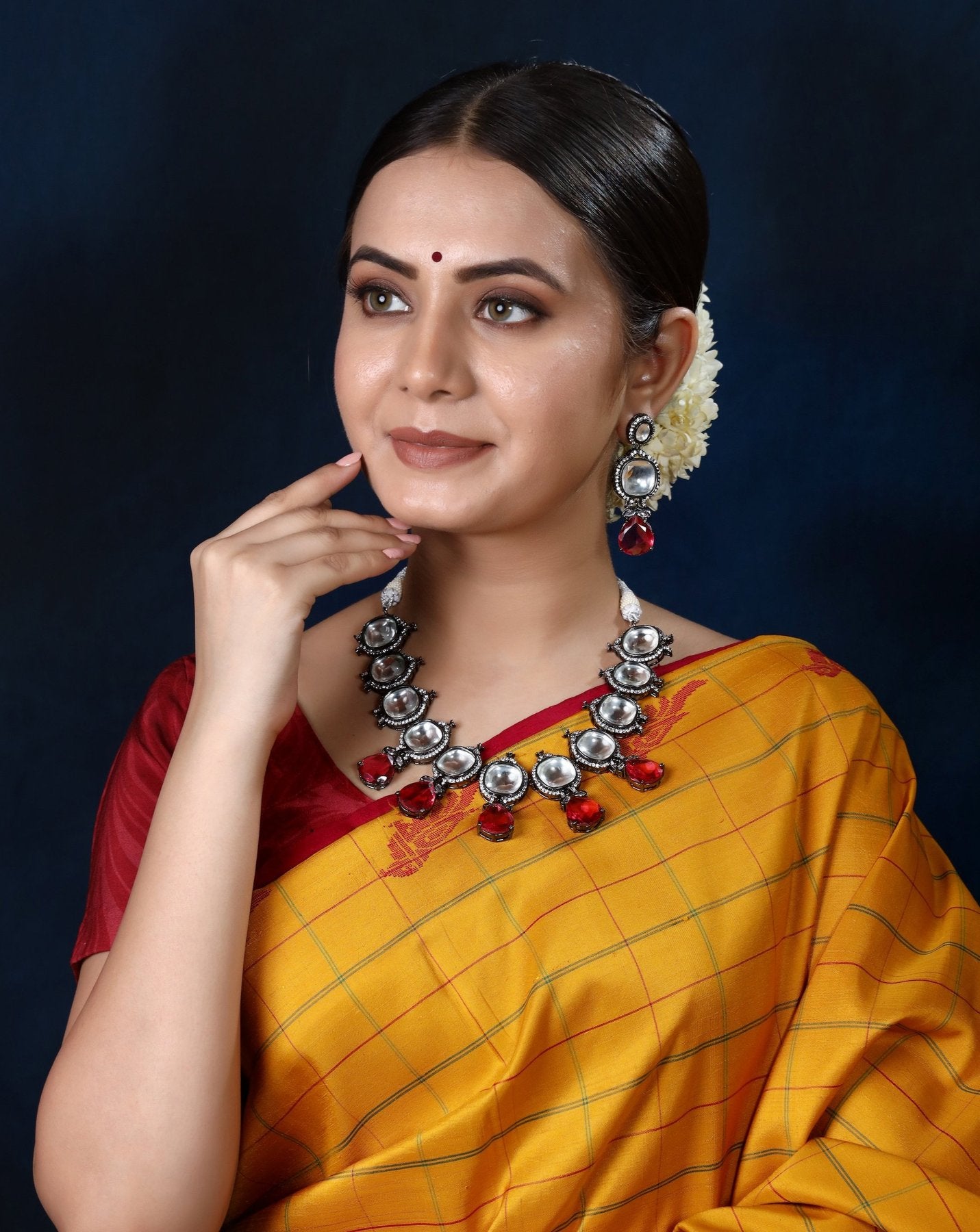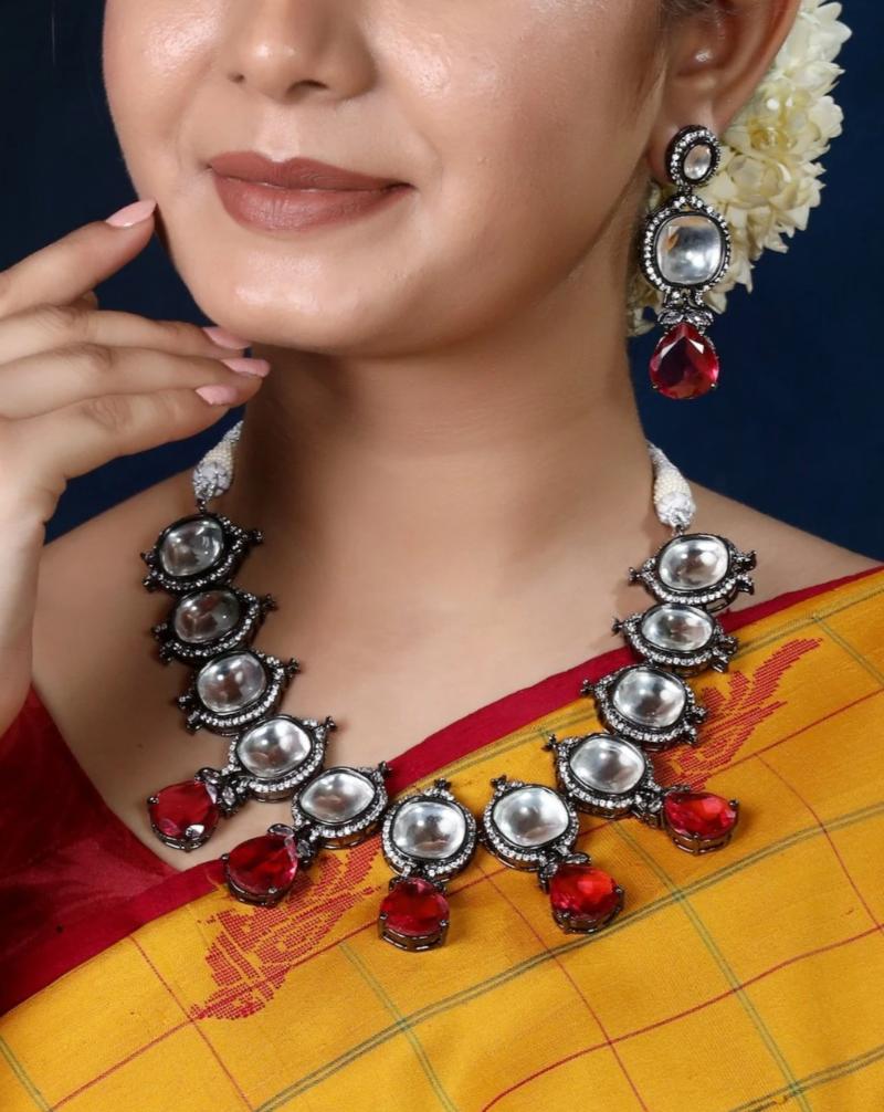 Imeora Designer Necklace Set With Five Red Stone Hangings And Handmade Dori