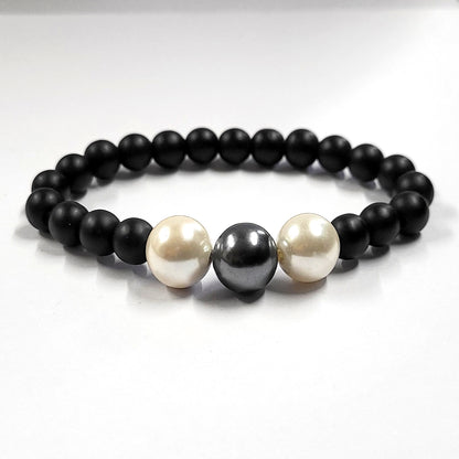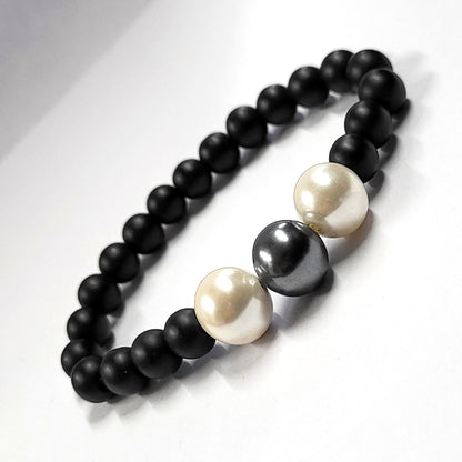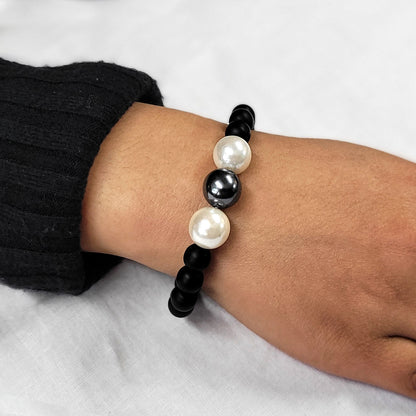 Metallic Black And White Shell Pearls 12mm Bracelet With 8mm Black Beads