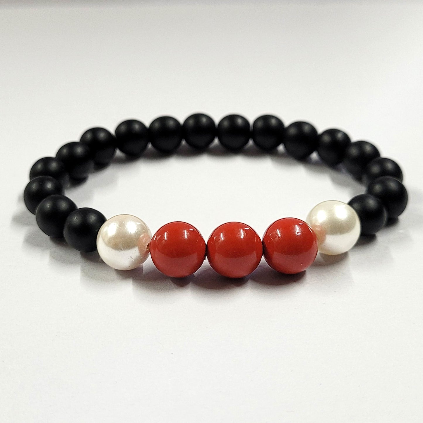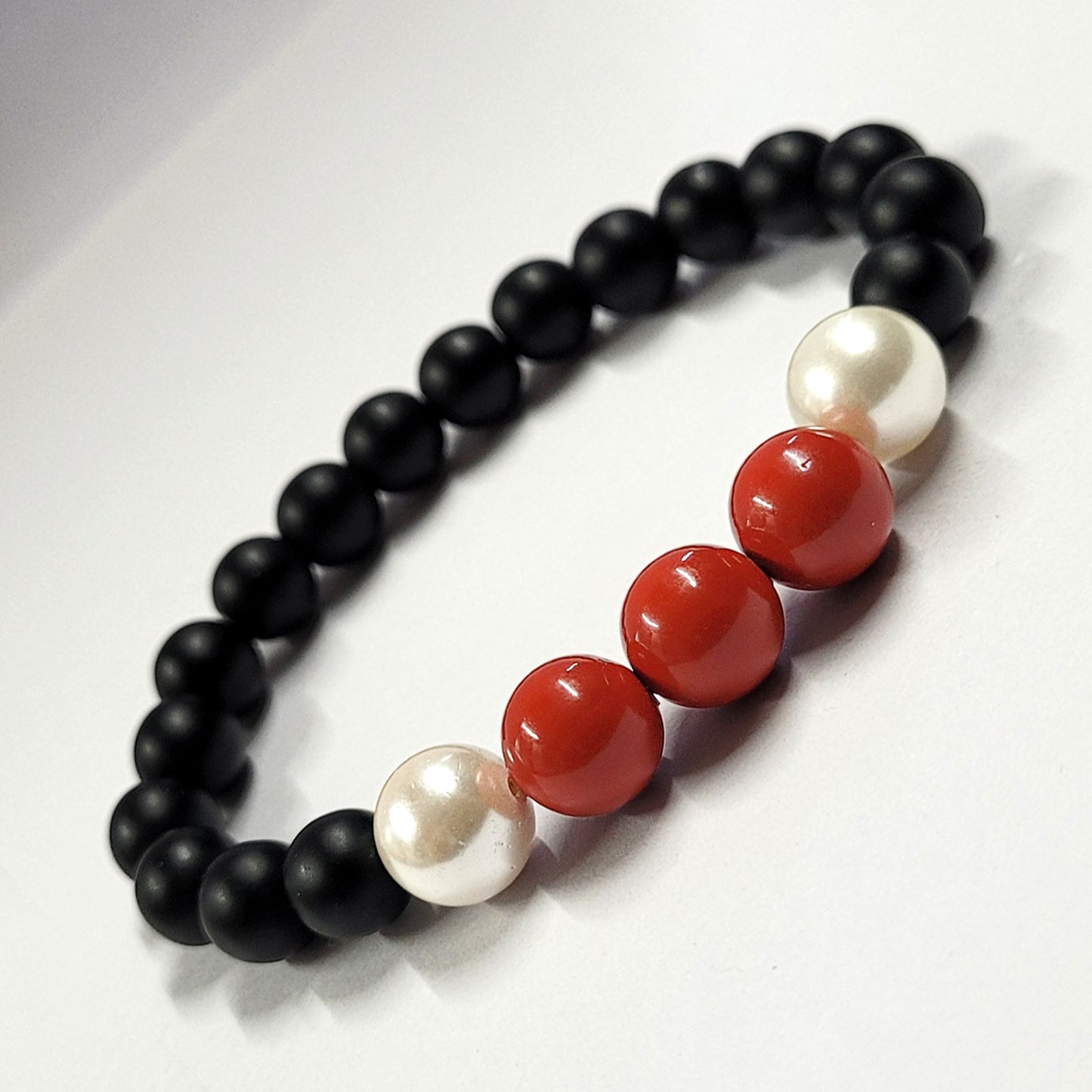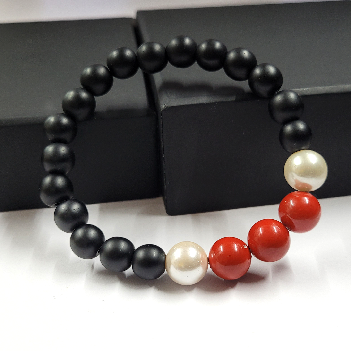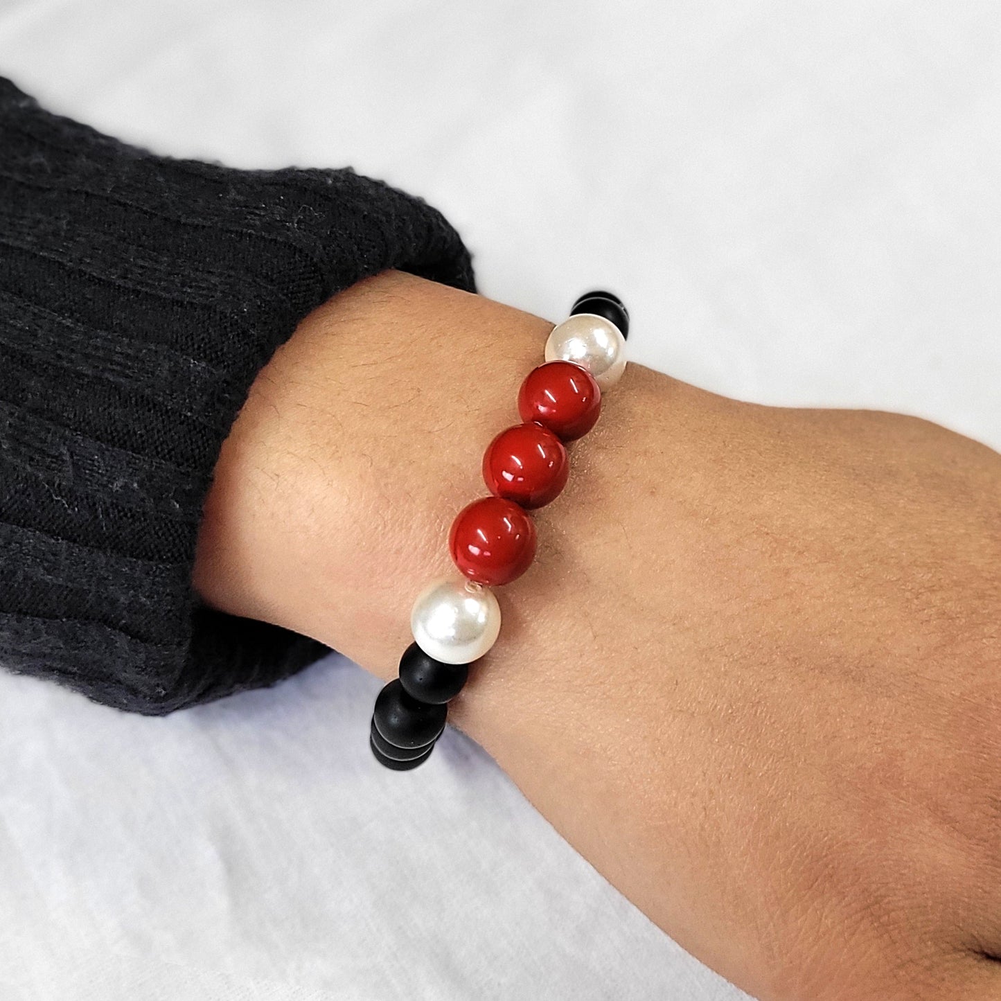 Red And White Shell Pearls 10mm Bracelet With 8mm Black Beads